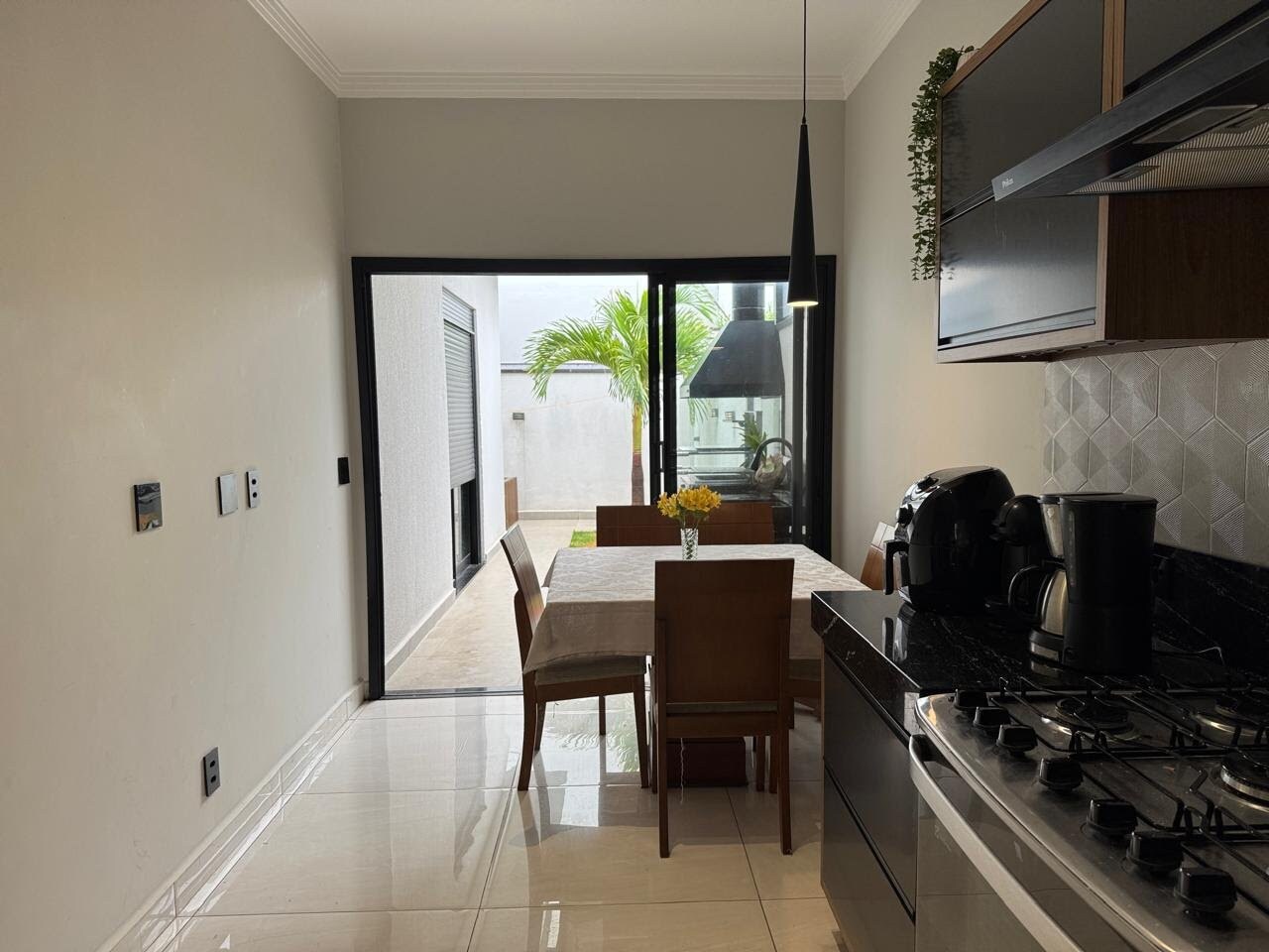 São 3 dormitórios (1 suíte), sala com pé-direito alto, cozinha americana planejada com ilha, e um espaço gourmet completo com churrasqueira e jardim privativo.
